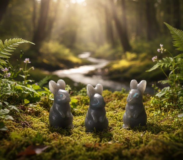 Laissez-vous séduire par la magie de la Labradorite, la pierre de protection par excellence, sculptée avec soin en d'adorables petits lapins.